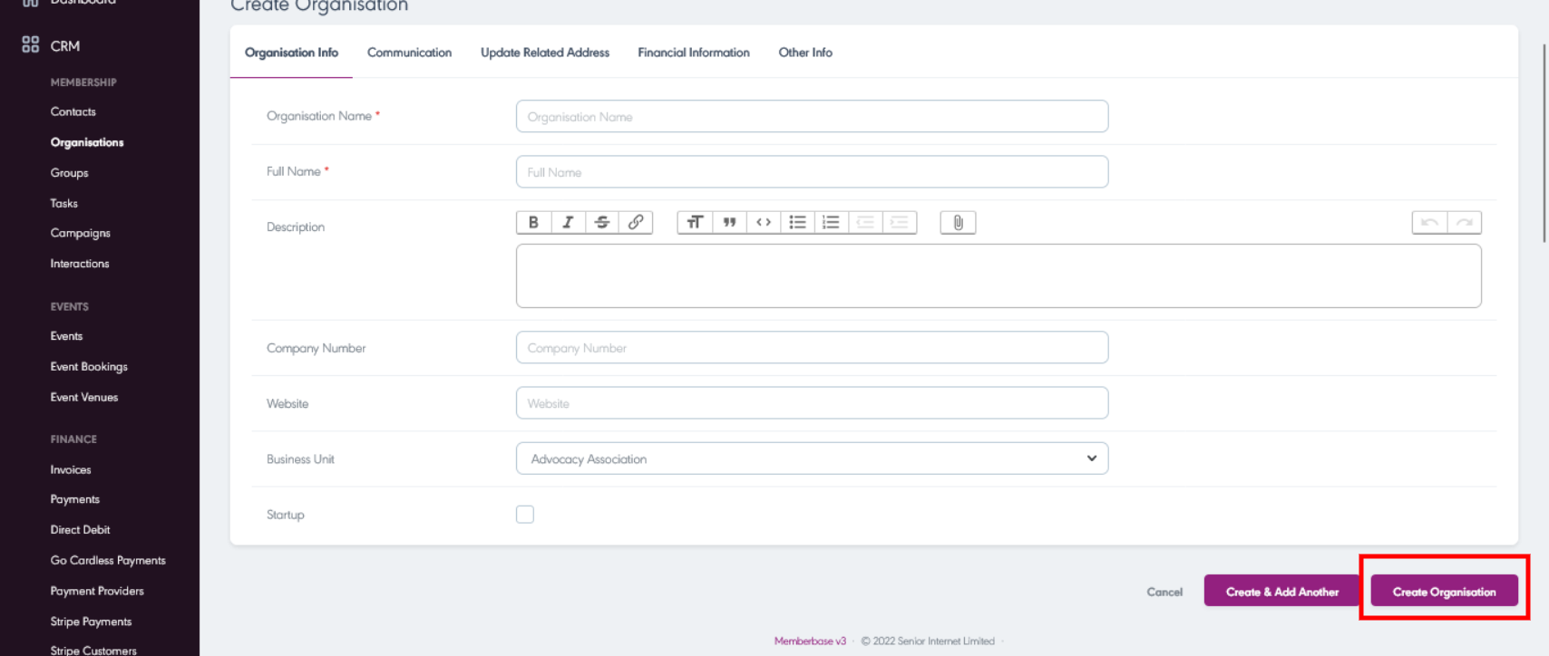 iii. Fill in the form that is displayed with the organisations details and click "Create Organisation". This will add the organisation to the list of Organisation records within the system.
